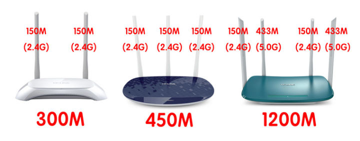 因此大多數300M的無線路由器都是2根2.4G的天線,而450M的就是3根2.4G的天線。而1200M的雙頻路由器,是兩根2.4G的天線(300Mps)+2根5.0G的天線(867Mbps)≈1200M。