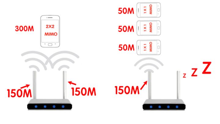 比如說你的路由器是2根天線的2×2MIMO,如果你的手機也支持2×2MIMO,那么路由器會用兩根天線同時給手機傳送數據;如果你的手機是1根天線的,那么它也只能用到路由器的1根天線,速度會比2根天線的慢一半。這個時候路由器其他的天線都是在偷懶的。